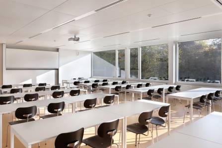 - Erdgeschoss: Hörsaal, Bibliothek, Cafeteria und Klassenzimmer