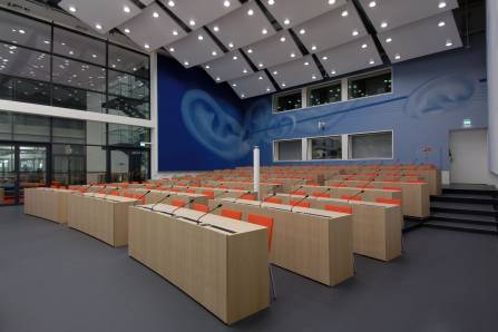 Kernpunkt des Projektes ist das vertikal ausgerichtete Foyer mit dem freistehenden, markanten Liftkörper. Dieser zentrale Aufenthalts-, Verkehrs- und Kommunikationsraum erschliesst und verbindet das gesamte Gebäude. Insbesondere werden damit der Presse-konferenzsaal mit 120 Plätzen im 2. Untergeschoss und die Fernsehstudios mit dem 280 m² grossen Multimediaraum im 3. Untergeschoss auf attraktive Weise mit dem Eingangsgeschoss verbunden. In den Obergeschossen befinden sich die Büro-, Redaktions- und Produktionsarbeitsplätze mit den CUT-Räumen und Radiostudios.